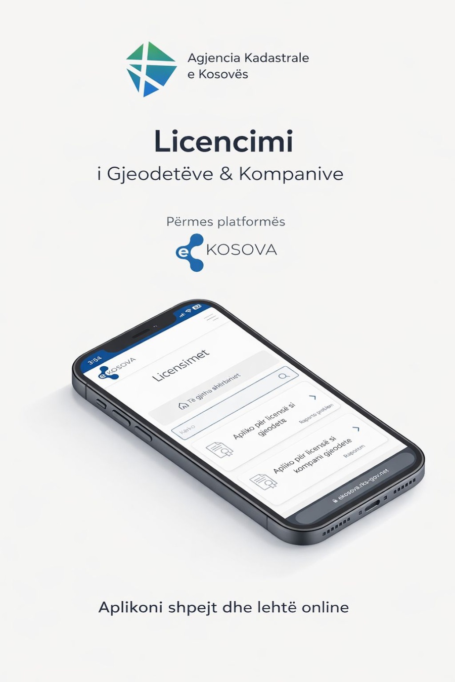 Agjencia Kadastrale e Kosovës njofton të gjithë të interesuarit që plotësojnë kushtet për tu pajisur me licencë, që është hapur afati për aplikim për licencim në platformën 𝐞𝐊𝐨𝐬𝐨𝐯𝐚, përkatësisht në Sistemin për Licencim. Afati do të jetë i hapur deri me datë 15.04.2026 në ora 16:00.